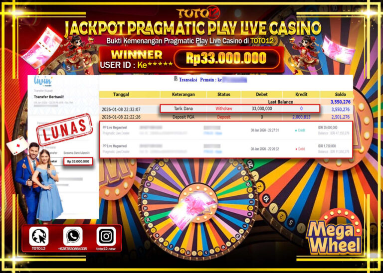 HANYA DI TOTO12 JP PASTI DI BAYAR LUNAS DAN CEPAT!!!!!! JACKPOT PRAGMATIC PLAY LIVE CASINO(MEGA WHEEL) Rp.33.000.000 !!!!