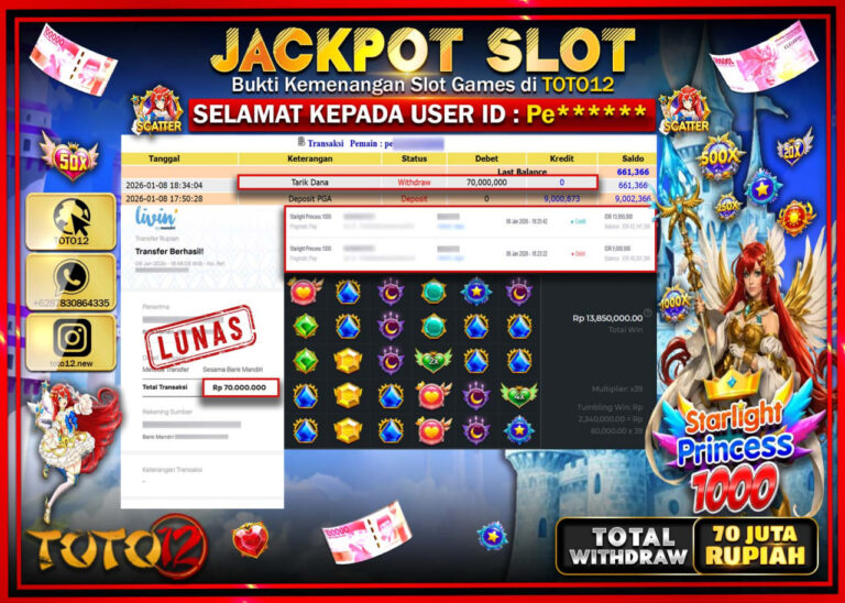 Selamat kepada Member Kami Pe****** Telah Jackpot dan berhasil mendapatkan kemenangan besar pada permainan JACKPOT SLOT GAME (STARLIGHT PRINCESS 1000) Dengan Kemenangan Sebesar Rp.70.000.000 –. Setelah mengisi Fomulir Withdraw dengan Kurang waktu 1-2 Menit Dana sudah kami Trasnfer kepada Pemilik Userid dan dana sudah dapat di cairkan oleh pemenang. Bukti Pembayaran yang TOTO12 berikan merupakan Bukti…