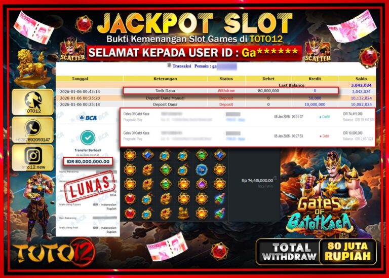 Selamat kepada Member Kami Ga****** Telah Jackpot dan berhasil mendapatkan kemenangan besar pada permainan JACKPOT SLOT GAME (GATES OF GATOT KACA) Dengan Kemenangan Sebesar Rp.80.000.000 –. Setelah mengisi Fomulir Withdraw dengan Kurang waktu 1-2 Menit Dana sudah kami Trasnfer kepada Pemilik Userid dan dana sudah dapat di cairkan oleh pemenang. Bukti Pembayaran yang TOTO12 berikan merupakan…