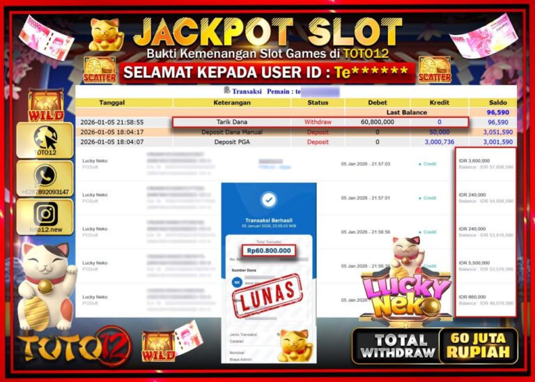 Selamat kepada Member Kami Te****** Telah Jackpot dan berhasil mendapatkan kemenangan besar pada permainan JACKPOT SLOT GAME (LUCKY NEKO) Dengan Kemenangan Sebesar Rp.60.800.000 –. Setelah mengisi Fomulir Withdraw dengan Kurang waktu 1-2 Menit Dana sudah kami Trasnfer kepada Pemilik Userid dan dana sudah dapat di cairkan oleh pemenang. Bukti Pembayaran yang TOTO12 berikan merupakan Bukti Pembayaran…