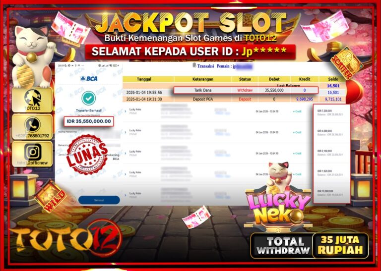 Selamat kepada Member Kami Jp****** Telah Jackpot dan berhasil mendapatkan kemenangan besar pada permainan JACKPOT SLOT GAME (LUCKY NEKO) Dengan Kemenangan Sebesar Rp.35.550.000 –. Setelah mengisi Fomulir Withdraw dengan Kurang waktu 1-2 Menit Dana sudah kami Trasnfer kepada Pemilik Userid dan dana sudah dapat di cairkan oleh pemenang. Bukti Pembayaran yang TOTO12 berikan merupakan Bukti Pembayaran…