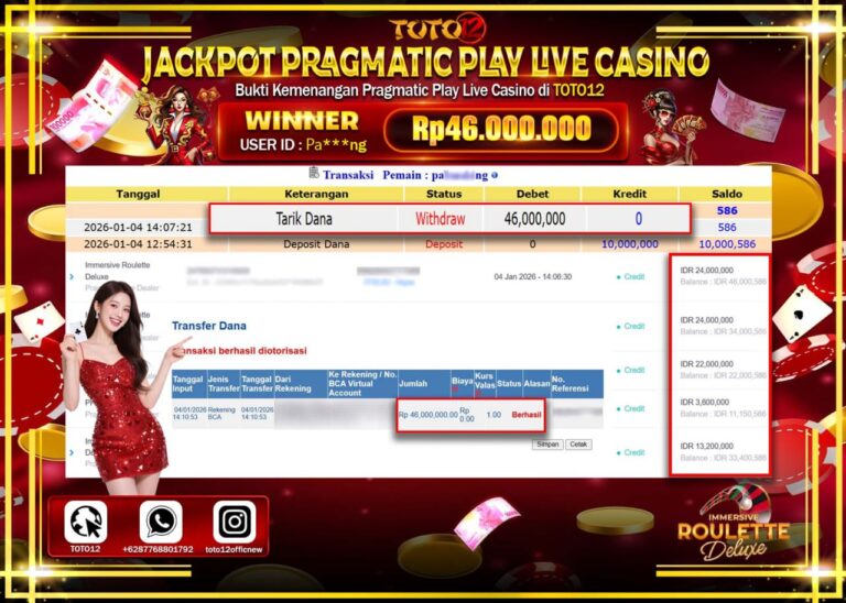 Selamat kepada Member Kami Pa****** Telah Jackpot dan berhasil mendapatkan kemenangan besar pada permainan JACKPOT PRAGMATIC PLAY LIVE CASINO (ROULETTE) Dengan Kemenangan Sebesar Rp.46.000.000 –. Setelah mengisi Fomulir Withdraw dengan Kurang waktu 1-2 Menit Dana sudah kami Trasnfer kepada Pemilik Userid dan dana sudah dapat di cairkan oleh pemenang. Bukti Pembayaran yang TOTO12 berikan merupakan Bukti…