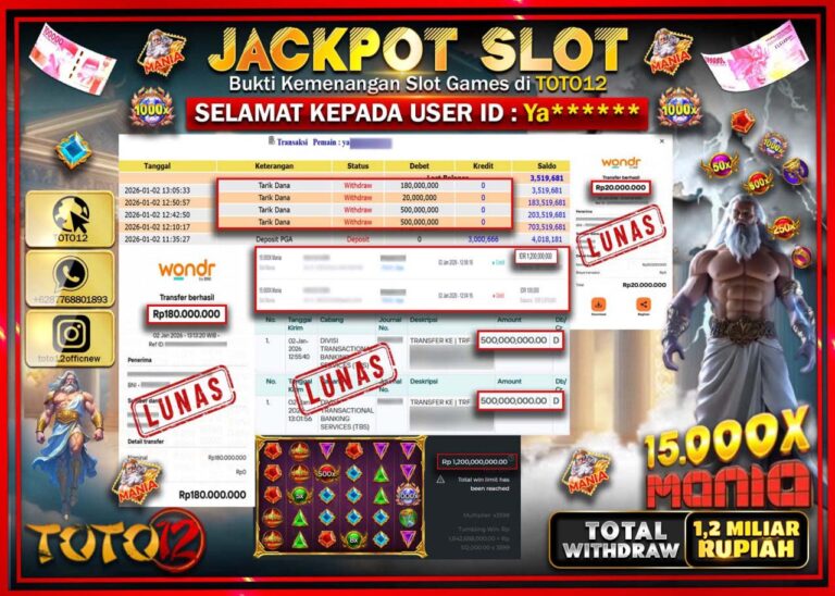 Selamat kepada Member Kami Ya****** Telah Jackpot dan berhasil mendapatkan kemenangan besar pada permainan JACKPOT SLOT GAME (15.000X MANIA) Dengan Kemenangan Sebesar Rp.1.200.000.000 –. Setelah mengisi Fomulir Withdraw dengan Kurang waktu 1-2 Menit Dana sudah kami Trasnfer kepada Pemilik Userid dan dana sudah dapat di cairkan oleh pemenang. Bukti Pembayaran yang TOTO12 berikan merupakan Bukti Pembayaran…