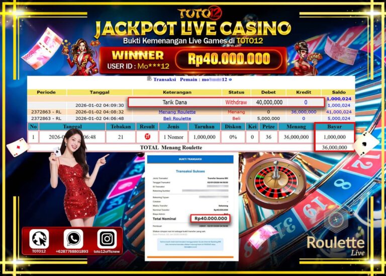Selamat kepada Member Kami Mo****** Telah Jackpot dan berhasil mendapatkan kemenangan besar pada permainan JACKPOT LIVE CASINO (ROULETTE) Dengan Kemenangan Sebesar Rp.40.000.000 –. Setelah mengisi Fomulir Withdraw dengan Kurang waktu 1-2 Menit Dana sudah kami Trasnfer kepada Pemilik Userid dan dana sudah dapat di cairkan oleh pemenang. Bukti Pembayaran yang TOTO12 berikan merupakan Bukti Pembayaran yang SAH…