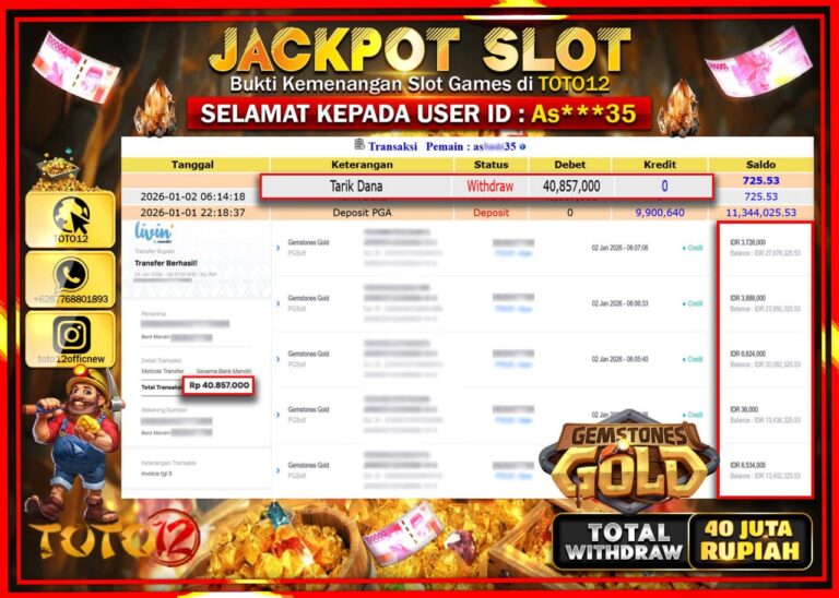 Selamat kepada Member Kami As****** Telah Jackpot dan berhasil mendapatkan kemenangan besar pada permainan JACKPOT SLOT GAME (GEMSTONES GOLD) Dengan Kemenangan Sebesar Rp.40.857.000 –. Setelah mengisi Fomulir Withdraw dengan Kurang waktu 1-2 Menit Dana sudah kami Trasnfer kepada Pemilik Userid dan dana sudah dapat di cairkan oleh pemenang. Bukti Pembayaran yang TOTO12 berikan merupakan Bukti Pembayaran…