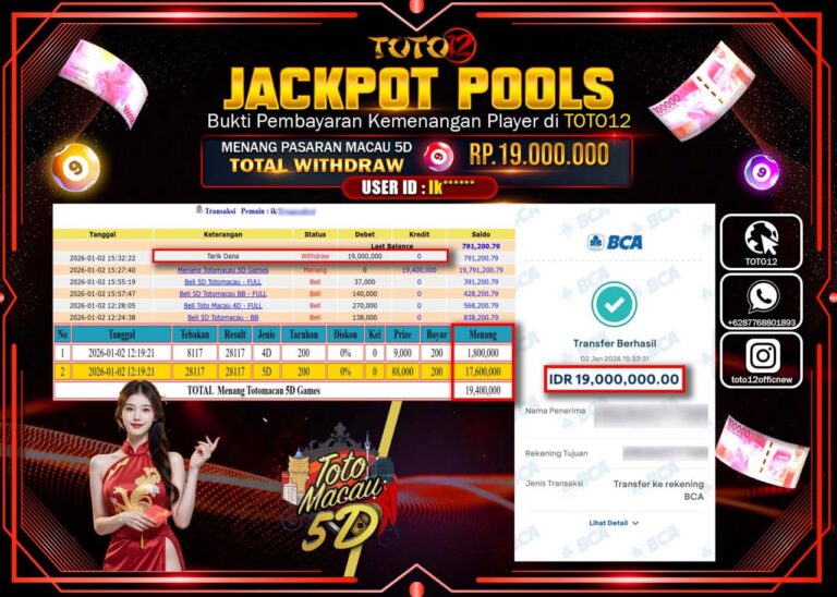 Selamat kepada Member Kami Ik****** Telah Jackpot dan berhasil mendapatkan kemenangan besar pada permainan JACKPOT POOLS PASARAN (MACAU 5D) Dengan Kemenangan Sebesar Rp.19.000.000 –. Setelah mengisi Fomulir Withdraw dengan Kurang waktu 1-2 Menit Dana sudah kami Trasnfer kepada Pemilik Userid dan dana sudah dapat di cairkan oleh pemenang. Bukti Pembayaran yang TOTO12 berikan merupakan Bukti Pembayaran…