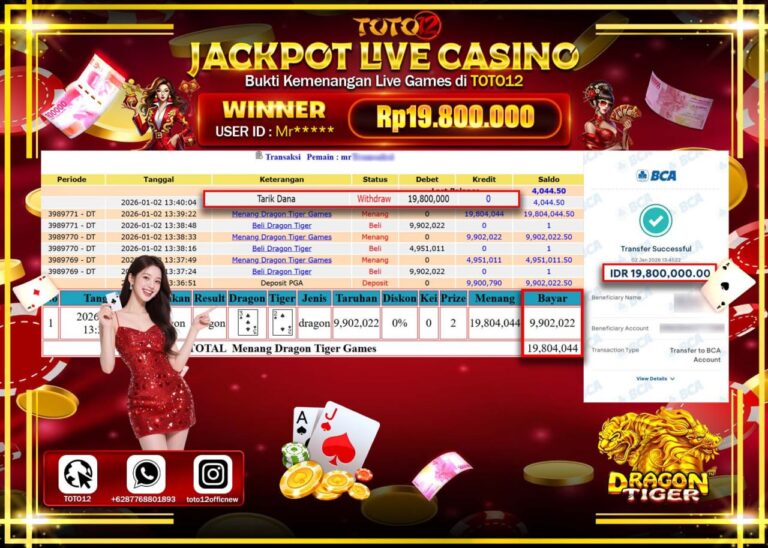Selamat kepada Member Kami Mr****** Telah Jackpot dan berhasil mendapatkan kemenangan besar pada permainan JACKPOT LIVE CASINO (DRAGON TIGER) Dengan Kemenangan Sebesar Rp.19.800.000 –. Setelah mengisi Fomulir Withdraw dengan Kurang waktu 1-2 Menit Dana sudah kami Trasnfer kepada Pemilik Userid dan dana sudah dapat di cairkan oleh pemenang. Bukti Pembayaran yang TOTO12 berikan merupakan Bukti Pembayaran…