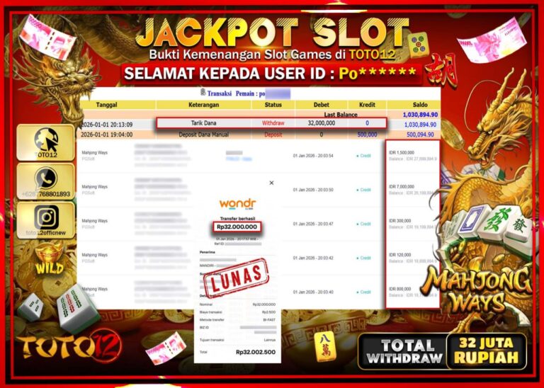 Selamat kepada Member Kami Po****** Telah Jackpot dan berhasil mendapatkan kemenangan besar pada permainan JACKPOT SLOT GAME (MAHJONG WAYS) Dengan Kemenangan Sebesar Rp.32.000.000 –. Setelah mengisi Fomulir Withdraw dengan Kurang waktu 1-2 Menit Dana sudah kami Trasnfer kepada Pemilik Userid dan dana sudah dapat di cairkan oleh pemenang. Bukti Pembayaran yang TOTO12 berikan merupakan Bukti Pembayaran…