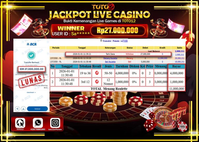 Selamat kepada Member Kami Sa****** Telah Jackpot dan berhasil mendapatkan kemenangan besar pada permainan JACKPOT LIVE CASINO (ROULETTE) Dengan Kemenangan Sebesar Rp.27.000.000 –. Setelah mengisi Fomulir Withdraw dengan Kurang waktu 1-2 Menit Dana sudah kami Trasnfer kepada Pemilik Userid dan dana sudah dapat di cairkan oleh pemenang. Bukti Pembayaran yang TOTO12 berikan merupakan Bukti Pembayaran yang SAH…