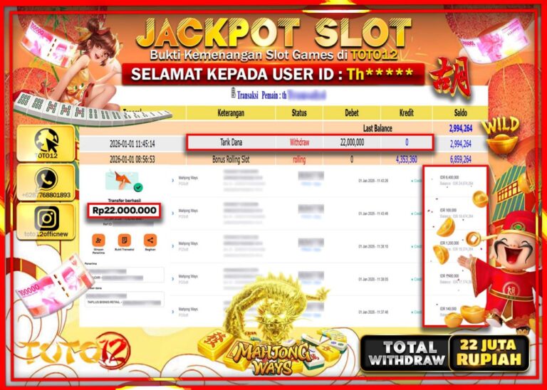 Selamat kepada Member Kami Th****** Telah Jackpot dan berhasil mendapatkan kemenangan besar pada permainan JACKPOT SLOT GAME (MAHJONG WAYS) Dengan Kemenangan Sebesar Rp.22.000.000 –. Setelah mengisi Fomulir Withdraw dengan Kurang waktu 1-2 Menit Dana sudah kami Trasnfer kepada Pemilik Userid dan dana sudah dapat di cairkan oleh pemenang. Bukti Pembayaran yang TOTO12 berikan merupakan Bukti Pembayaran…
