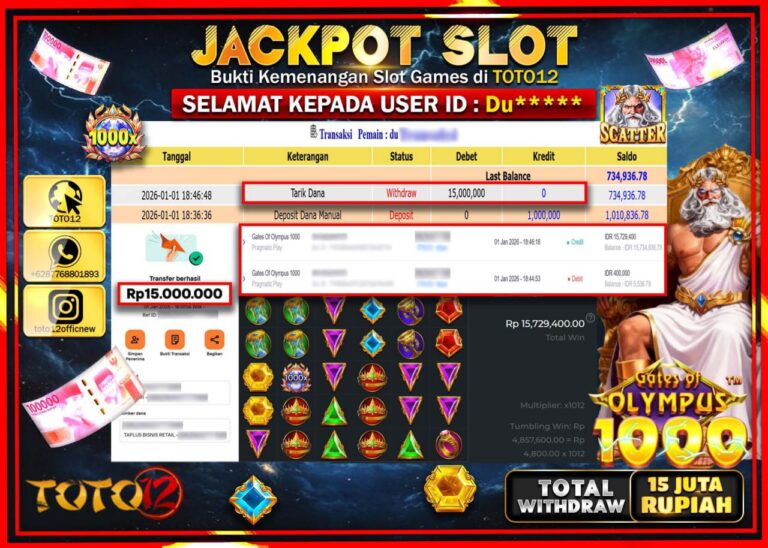 Selamat kepada Member Kami Du****** Telah Jackpot dan berhasil mendapatkan kemenangan besar pada permainan JACKPOT SLOT GAME (GATES OF OLYMPUS 1000) Dengan Kemenangan Sebesar Rp.15.000.000 –. Setelah mengisi Fomulir Withdraw dengan Kurang waktu 1-2 Menit Dana sudah kami Trasnfer kepada Pemilik Userid dan dana sudah dapat di cairkan oleh pemenang. Bukti Pembayaran yang TOTO12 berikan merupakan…