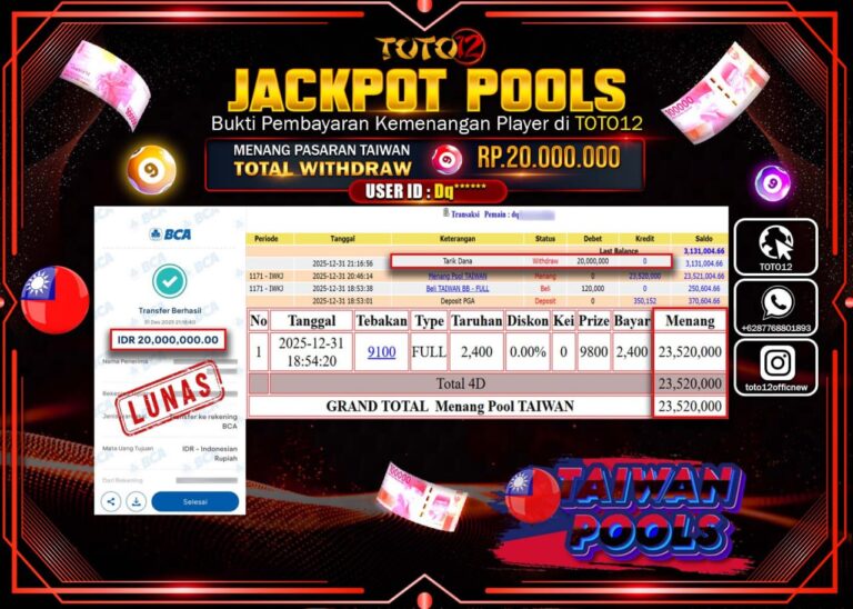 Selamat kepada Member Kami Dq****** Telah Jackpot dan berhasil mendapatkan kemenangan besar pada permainan JACKPOT POOLS PASARAN (TAIWAN) Dengan Kemenangan Sebesar Rp.20.000.000 –. Setelah mengisi Fomulir Withdraw dengan Kurang waktu 1-2 Menit Dana sudah kami Trasnfer kepada Pemilik Userid dan dana sudah dapat di cairkan oleh pemenang. Bukti Pembayaran yang TOTO12 berikan merupakan Bukti Pembayaran yang SAH…