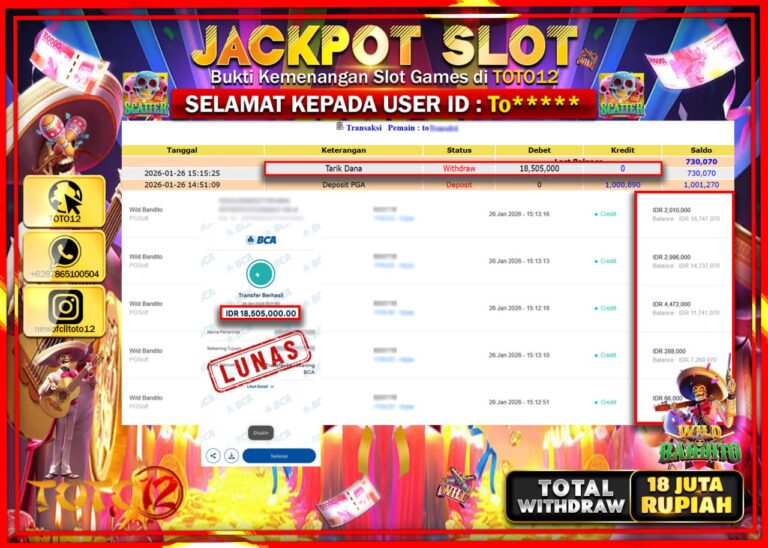 Selamat kepada Member Kami To****** Telah Jackpot dan berhasil mendapatkan kemenangan besar pada permainan JACKPOT SLOT GAME (WILD BANDITO) Dengan Kemenangan Sebesar Rp.18.505.000 –. Setelah mengisi Fomulir Withdraw dengan Kurang waktu 1-2 Menit Dana sudah kami Trasnfer kepada Pemilik Userid dan dana sudah dapat di cairkan oleh pemenang. Bukti Pembayaran yang TOTO12 berikan merupakan Bukti Pembayaran…