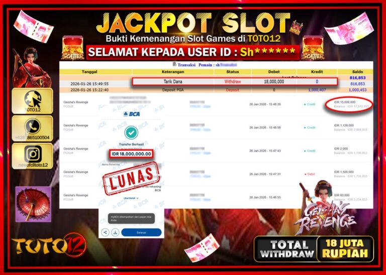 Selamat kepada Member Kami Sh****** Telah Jackpot dan berhasil mendapatkan kemenangan besar pada permainan JACKPOT SLOT GAME (GEISHAS REVENGE) Dengan Kemenangan Sebesar Rp.18.000.000 –. Setelah mengisi Fomulir Withdraw dengan Kurang waktu 1-2 Menit Dana sudah kami Trasnfer kepada Pemilik Userid dan dana sudah dapat di cairkan oleh pemenang. Bukti Pembayaran yang TOTO12 berikan merupakan Bukti Pembayaran…