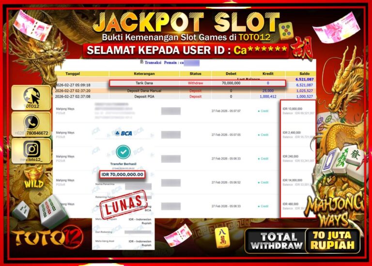Selamat kepada Member Kami Ca***** Telah Jackpot dan berhasil mendapatkan kemenangan besar pada permainan JACKPOT SLOT GAME (MAHJONG WAYS) Dengan Kemenangan Sebesar Rp.70.000.000–. Setelah mengisi Fomulir Withdraw dengan Kurang waktu 1-2 Menit Dana sudah kami Trasnfer kepada Pemilik Userid dan dana sudah dapat di cairkan oleh pemenang. Bukti Pembayaran yang TOTO12 berikan merupakan Bukti Pembayaran yang SAH…