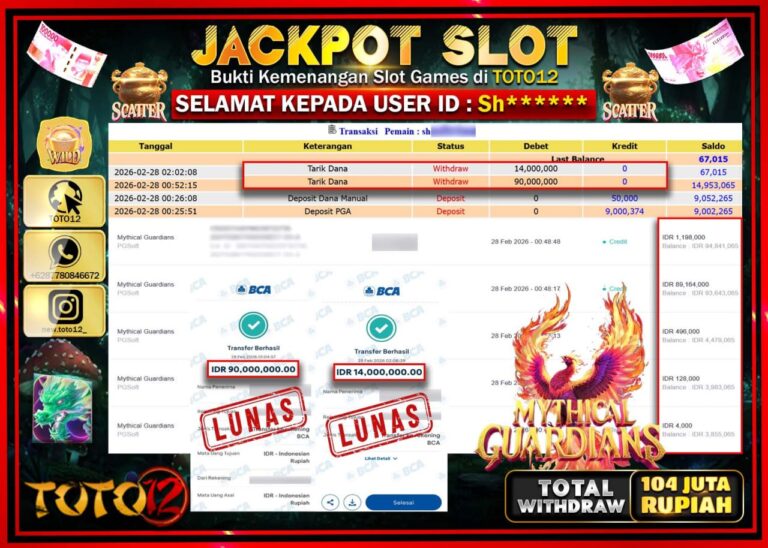 Selamat kepada Member Kami Sh***** Telah Jackpot dan berhasil mendapatkan kemenangan besar pada permainan JACKPOT SLOT GAME (MYTHICAL GUARDIANS) Dengan Kemenangan Sebesar Rp.104.000.000–. Setelah mengisi Fomulir Withdraw dengan Kurang waktu 1-2 Menit Dana sudah kami Trasnfer kepada Pemilik Userid dan dana sudah dapat di cairkan oleh pemenang. Bukti Pembayaran yang TOTO12 berikan merupakan Bukti Pembayaran yang SAH…