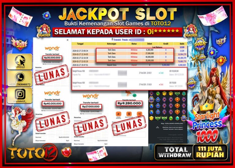 Selamat kepada Member Kami Oi***** Telah Jackpot dan berhasil mendapatkan kemenangan besar pada permainan JACKPOT SLOT GAME (STARLIGHT PRINCESS 1000) Dengan Kemenangan Sebesar Rp.111.280.000–. Setelah mengisi Fomulir Withdraw dengan Kurang waktu 1-2 Menit Dana sudah kami Trasnfer kepada Pemilik Userid dan dana sudah dapat di cairkan oleh pemenang. Bukti Pembayaran yang TOTO12 berikan merupakan Bukti Pembayaran…