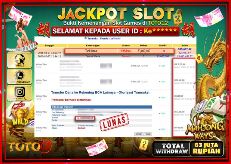 Selamat kepada Member Kami Ke***** Telah Jackpot dan berhasil mendapatkan kemenangan besar pada permainan JACKPOT SLOT GAME (MAHJONG WAYS) Dengan Kemenangan Sebesar Rp.63.000.000–. Setelah mengisi Fomulir Withdraw dengan Kurang waktu 1-2 Menit Dana sudah kami Trasnfer kepada Pemilik Userid dan dana sudah dapat di cairkan oleh pemenang. Bukti Pembayaran yang TOTO12 berikan merupakan Bukti Pembayaran yang SAH…