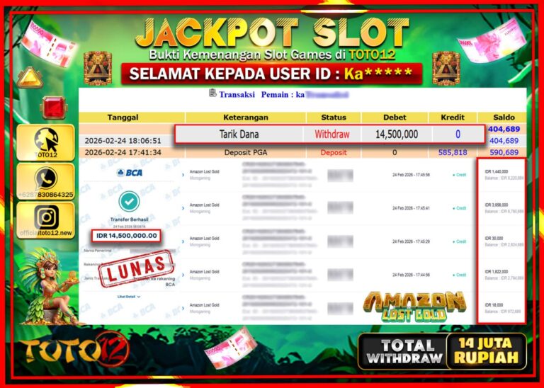 Selamat kepada Member Kami Ka***** Telah Jackpot dan berhasil mendapatkan kemenangan besar pada permainan JACKPOT SLOT GAME (AMAZON LOST GOLD) Dengan Kemenangan Sebesar Rp.14.500.000–. Setelah mengisi Fomulir Withdraw dengan Kurang waktu 1-2 Menit Dana sudah kami Trasnfer kepada Pemilik Userid dan dana sudah dapat di cairkan oleh pemenang. Bukti Pembayaran yang TOTO12 berikan merupakan Bukti Pembayaran…