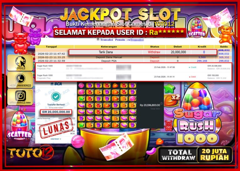 Selamat kepada Member Kami Ra***** Telah Jackpot dan berhasil mendapatkan kemenangan besar pada permainan JACKPOT SLOT GAME (SUGAR RUSH 1000) Dengan Kemenangan Sebesar Rp.20.000.000–. Setelah mengisi Fomulir Withdraw dengan Kurang waktu 1-2 Menit Dana sudah kami Trasnfer kepada Pemilik Userid dan dana sudah dapat di cairkan oleh pemenang. Bukti Pembayaran yang TOTO12 berikan merupakan Bukti Pembayaran…