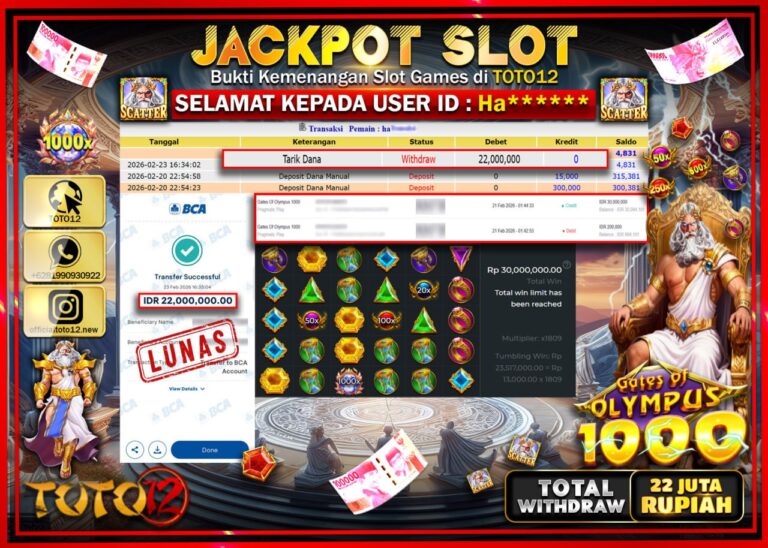Selamat kepada Member Kami Ha***** Telah Jackpot dan berhasil mendapatkan kemenangan besar pada permainan JACKPOT SLOT GAME (GATES OF OLYMPUS 1000) Dengan Kemenangan Sebesar Rp.22.000.000–. Setelah mengisi Fomulir Withdraw dengan Kurang waktu 1-2 Menit Dana sudah kami Trasnfer kepada Pemilik Userid dan dana sudah dapat di cairkan oleh pemenang. Bukti Pembayaran yang TOTO12 berikan merupakan Bukti…