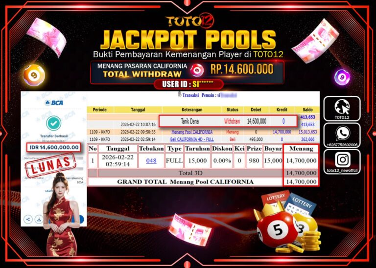 Selamat kepada Member Kami Si****** Telah Jackpot dan berhasil mendapatkan kemenangan besar pada permainan JACKPOT POOLS PASARAN (CALIFORNIA) Dengan Kemenangan Sebesar Rp.14.600.000–. Setelah mengisi Fomulir Withdraw dengan Kurang waktu 1-2 Menit Dana sudah kami Trasnfer kepada Pemilik Userid dan dana sudah dapat di cairkan oleh pemenang. Bukti Pembayaran yang TOTO12 berikan merupakan Bukti Pembayaran yang SAH /…