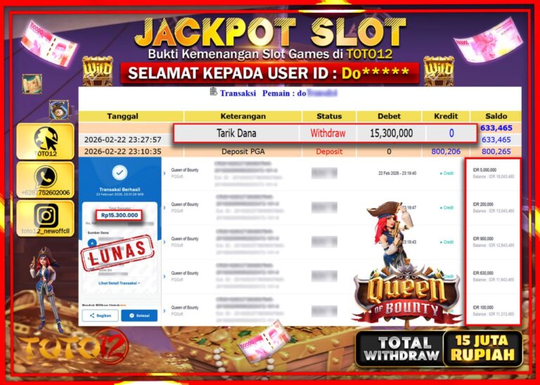 Selamat kepada Member Kami Do***** Telah Jackpot dan berhasil mendapatkan kemenangan besar pada permainan JACKPOT SLOT GAME (QUEEN OF BOUNTY) Dengan Kemenangan Sebesar Rp.15.300.000–. Setelah mengisi Fomulir Withdraw dengan Kurang waktu 1-2 Menit Dana sudah kami Trasnfer kepada Pemilik Userid dan dana sudah dapat di cairkan oleh pemenang. Bukti Pembayaran yang TOTO12 berikan merupakan Bukti Pembayaran…