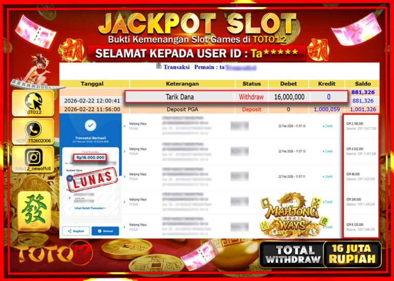 Selamat kepada Member Kami Ta***** Telah Jackpot dan berhasil mendapatkan kemenangan besar pada permainan JACKPOT SLOT GAME (MAHJONG WAYS) Dengan Kemenangan Sebesar Rp.16.000.000–. Setelah mengisi Fomulir Withdraw dengan Kurang waktu 1-2 Menit Dana sudah kami Trasnfer kepada Pemilik Userid dan dana sudah dapat di cairkan oleh pemenang. Bukti Pembayaran yang TOTO12 berikan merupakan Bukti Pembayaran yang SAH…