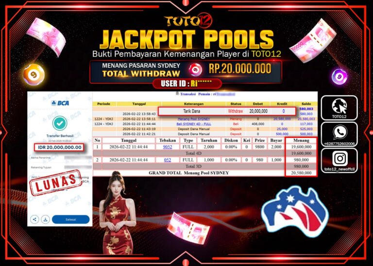 Selamat kepada Member Kami Ri****** Telah Jackpot dan berhasil mendapatkan kemenangan besar pada permainan JACKPOT POOLS PASARAN (SYDNEY) Dengan Kemenangan Sebesar Rp.20.000.000–. Setelah mengisi Fomulir Withdraw dengan Kurang waktu 1-2 Menit Dana sudah kami Trasnfer kepada Pemilik Userid dan dana sudah dapat di cairkan oleh pemenang. Bukti Pembayaran yang TOTO12 berikan merupakan Bukti Pembayaran yang SAH /…