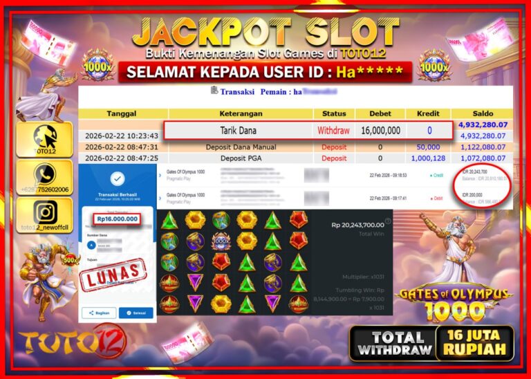 Selamat kepada Member Kami Mo***** Telah Jackpot dan berhasil mendapatkan kemenangan besar pada permainan JACKPOT SLOT GAME (GATES OF OLYMPUS 1000) Dengan Kemenangan Sebesar Rp.16.000.000–. Setelah mengisi Fomulir Withdraw dengan Kurang waktu 1-2 Menit Dana sudah kami Trasnfer kepada Pemilik Userid dan dana sudah dapat di cairkan oleh pemenang. Bukti Pembayaran yang TOTO12 berikan merupakan Bukti…