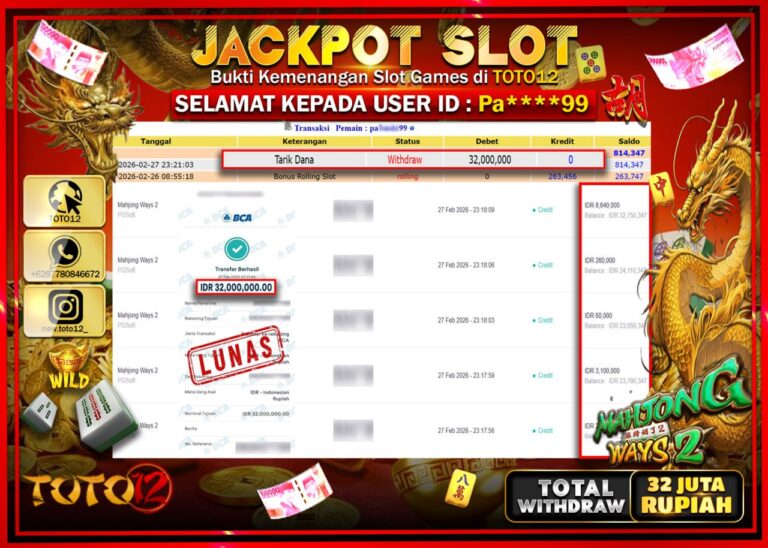 Selamat kepada Member Kami Pa*****99 Telah Jackpot dan berhasil mendapatkan kemenangan besar pada permainan JACKPOT SLOT GAME (MAHJONG WAYS 2) Dengan Kemenangan Sebesar Rp.32.000.000–. Setelah mengisi Fomulir Withdraw dengan Kurang waktu 1-2 Menit Dana sudah kami Trasnfer kepada Pemilik Userid dan dana sudah dapat di cairkan oleh pemenang. Bukti Pembayaran yang TOTO12 berikan merupakan Bukti Pembayaran…