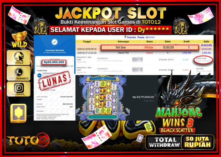 Selamat kepada Member Kami La***** Telah Jackpot dan berhasil mendapatkan kemenangan besar pada permainan JACKPOT SLOT GAME (MAHJONG WAYS) Dengan Kemenangan Sebesar Rp.50.000.000–. Setelah mengisi Fomulir Withdraw dengan Kurang waktu 1-2 Menit Dana sudah kami Trasnfer kepada Pemilik Userid dan dana sudah dapat di cairkan oleh pemenang. Bukti Pembayaran yang TOTO12 berikan merupakan Bukti Pembayaran yang SAH…