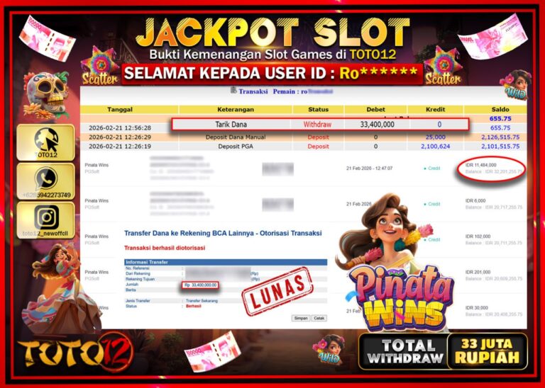 Selamat kepada Member Kami Ro***** Telah Jackpot dan berhasil mendapatkan kemenangan besar pada permainan JACKPOT SLOT GAME (PINATA WINS) Dengan Kemenangan Sebesar Rp.33.400.000–. Setelah mengisi Fomulir Withdraw dengan Kurang waktu 1-2 Menit Dana sudah kami Trasnfer kepada Pemilik Userid dan dana sudah dapat di cairkan oleh pemenang. Bukti Pembayaran yang TOTO12 berikan merupakan Bukti Pembayaran yang SAH…