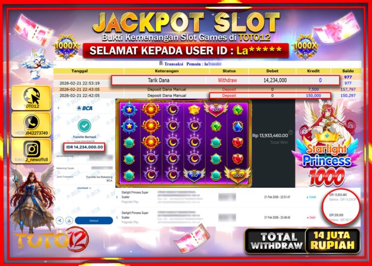 Selamat kepada Member Kami La***** Telah Jackpot dan berhasil mendapatkan kemenangan besar pada permainan JACKPOT SLOT GAME (RLIGHT PRINCESS 100) Dengan Kemenangan Sebesar Rp.14.234.000–. Setelah mengisi Fomulir Withdraw dengan Kurang waktu 1-2 Menit Dana sudah kami Trasnfer kepada Pemilik Userid dan dana sudah dapat di cairkan oleh pemenang. Bukti Pembayaran yang TOTO12 berikan merupakan Bukti Pembayaran…