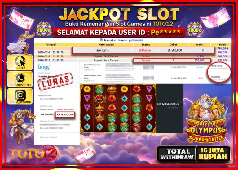 Selamat kepada Member Kami Du***** Telah Jackpot dan berhasil mendapatkan kemenangan besar pada permainan JACKPOT SLOT GAME (ROLLING IN TREASURES) Dengan Kemenangan Sebesar Rp.15.250.000–. Setelah mengisi Fomulir Withdraw dengan Kurang waktu 1-2 Menit Dana sudah kami Trasnfer kepada Pemilik Userid dan dana sudah dapat di cairkan oleh pemenang. Bukti Pembayaran yang TOTO12 berikan merupakan Bukti Pembayaran…