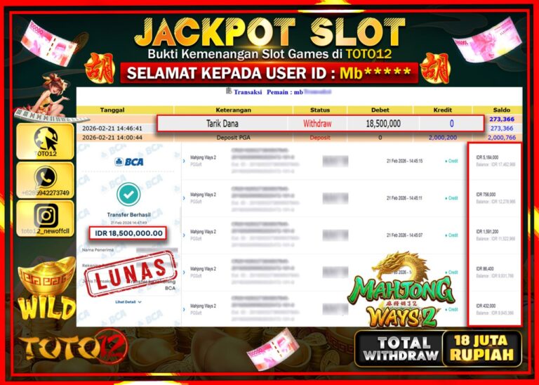 Selamat kepada Member Kami Mb***** Telah Jackpot dan berhasil mendapatkan kemenangan besar pada permainan JACKPOT SLOT GAME (MAHJONG WAYS 2) Dengan Kemenangan Sebesar Rp.18.500.000–. Setelah mengisi Fomulir Withdraw dengan Kurang waktu 1-2 Menit Dana sudah kami Trasnfer kepada Pemilik Userid dan dana sudah dapat di cairkan oleh pemenang. Bukti Pembayaran yang TOTO12 berikan merupakan Bukti Pembayaran…