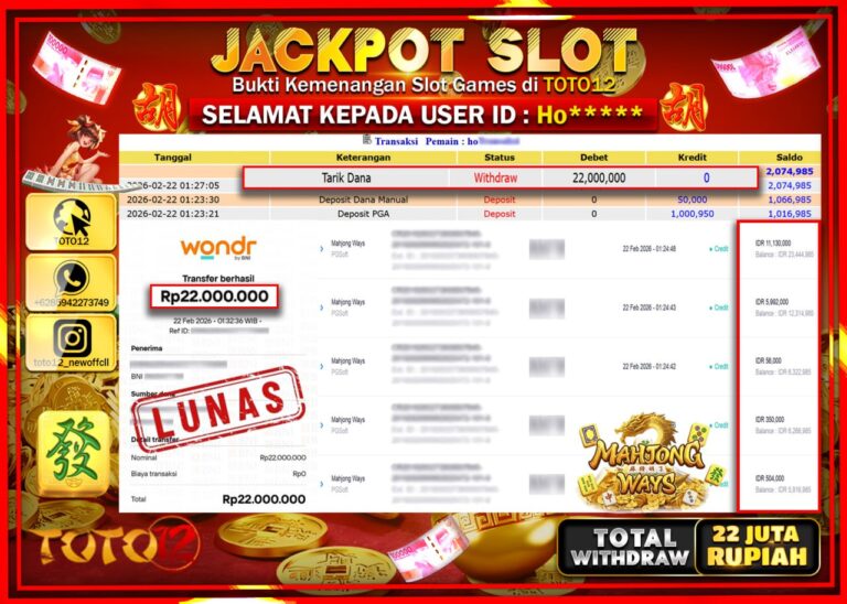 Selamat kepada Member Kami Ho***** Telah Jackpot dan berhasil mendapatkan kemenangan besar pada permainan JACKPOT SLOT GAME (AHJONG WAYS) Dengan Kemenangan Sebesar Rp.22.000.000–. Setelah mengisi Fomulir Withdraw dengan Kurang waktu 1-2 Menit Dana sudah kami Trasnfer kepada Pemilik Userid dan dana sudah dapat di cairkan oleh pemenang. Bukti Pembayaran yang TOTO12 berikan merupakan Bukti Pembayaran yang SAH…