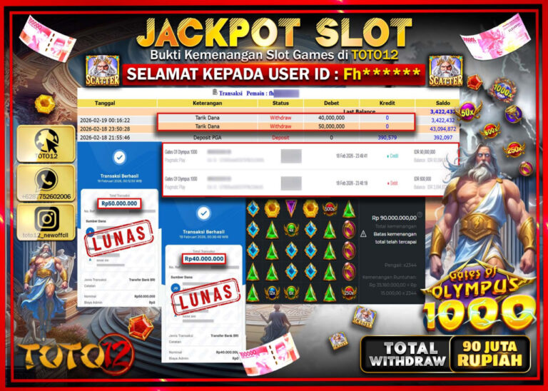 Selamat kepada Member Kami Fh****** Telah Jackpot dan berhasil mendapatkan kemenangan besar pada permainan JACKPOT SLOT GAME (GATES OF OLYMPUS 1000) Dengan Kemenangan Sebesar Rp.90.000.000–. Setelah mengisi Fomulir Withdraw dengan Kurang waktu 1-2 Menit Dana sudah kami Trasnfer kepada Pemilik Userid dan dana sudah dapat di cairkan oleh pemenang. Bukti Pembayaran yang TOTO12 berikan merupakan Bukti…