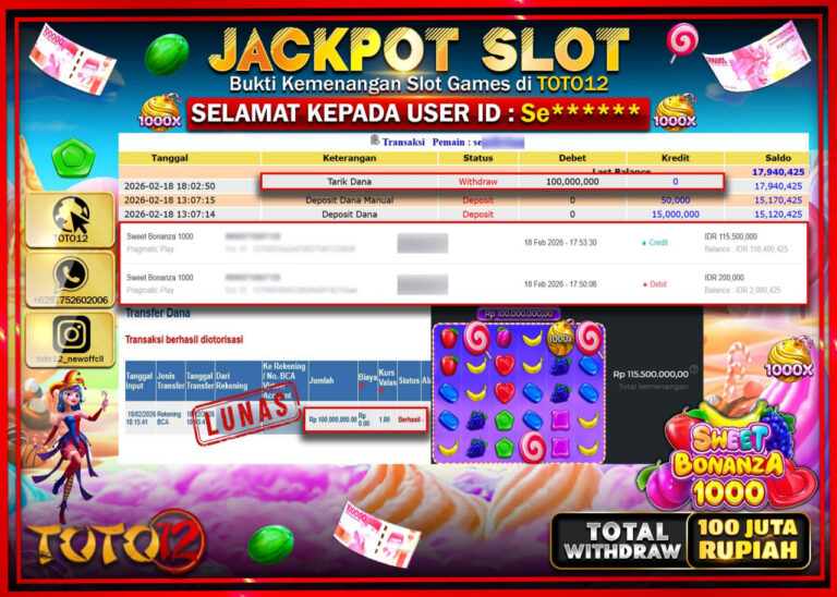 Selamat kepada Member Kami Se****** Telah Jackpot dan berhasil mendapatkan kemenangan besar pada permainan JACKPOT SLOT GAME (SWEET BONANZA 1000) Dengan Kemenangan Sebesar Rp.100.000.000–. Setelah mengisi Fomulir Withdraw dengan Kurang waktu 1-2 Menit Dana sudah kami Trasnfer kepada Pemilik Userid dan dana sudah dapat di cairkan oleh pemenang. Bukti Pembayaran yang TOTO12 berikan merupakan Bukti Pembayaran…