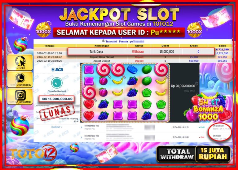 Selamat kepada Member Kami Pu****** Telah Jackpot dan berhasil mendapatkan kemenangan besar pada permainan JACKPOT SLOT GAME (SWEET BONANZA 1000) Dengan Kemenangan Sebesar Rp.15.000.000–. Setelah mengisi Fomulir Withdraw dengan Kurang waktu 1-2 Menit Dana sudah kami Trasnfer kepada Pemilik Userid dan dana sudah dapat di cairkan oleh pemenang. Bukti Pembayaran yang TOTO12 berikan merupakan Bukti Pembayaran…