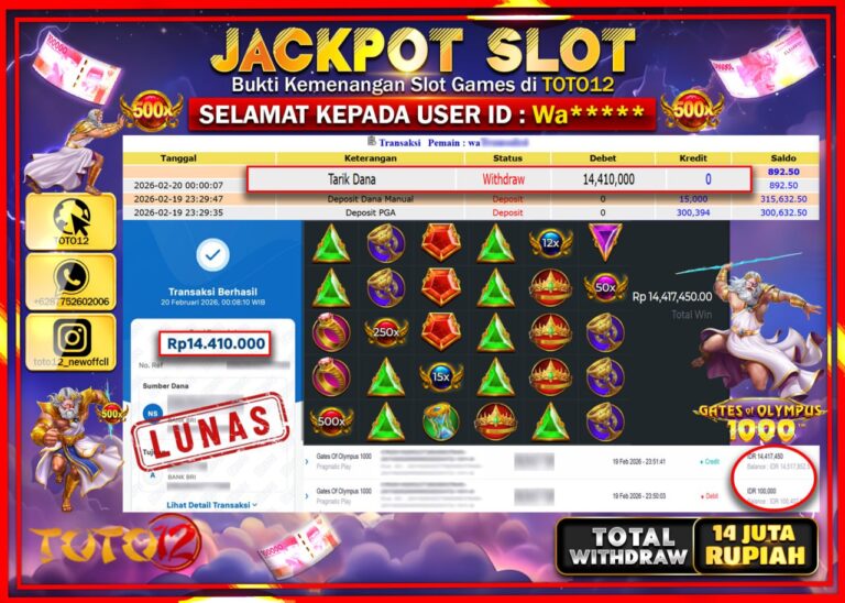 Selamat kepada Member Kami Wa****** Telah Jackpot dan berhasil mendapatkan kemenangan besar pada permainan JACKPOT SLOT GAME (GATES OF OLYMPUS 1000) Dengan Kemenangan Sebesar Rp.14.410.000–. Setelah mengisi Fomulir Withdraw dengan Kurang waktu 1-2 Menit Dana sudah kami Trasnfer kepada Pemilik Userid dan dana sudah dapat di cairkan oleh pemenang. Bukti Pembayaran yang TOTO12 berikan merupakan Bukti…