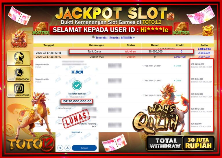 Selamat kepada Member Kami Hi******le Telah Jackpot dan berhasil mendapatkan kemenangan besar pada permainan JACKPOT SLOT GAME (WAYS OF THE QILIN) Dengan Kemenangan Sebesar Rp.30.000.000–. Setelah mengisi Fomulir Withdraw dengan Kurang waktu 1-2 Menit Dana sudah kami Trasnfer kepada Pemilik Userid dan dana sudah dapat di cairkan oleh pemenang. Bukti Pembayaran yang TOTO12 berikan merupakan Bukti…