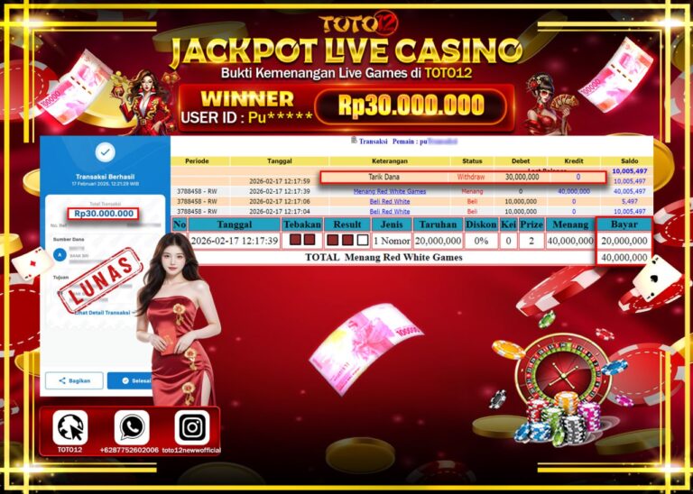 HANYA DI TOTO12 JP PASTI DI BAYAR LUNAS DAN CEPAT!!!!!! JACKPOT LIVE GAME CASINO (RED WHITE ) Rp.30.000.000!!!!