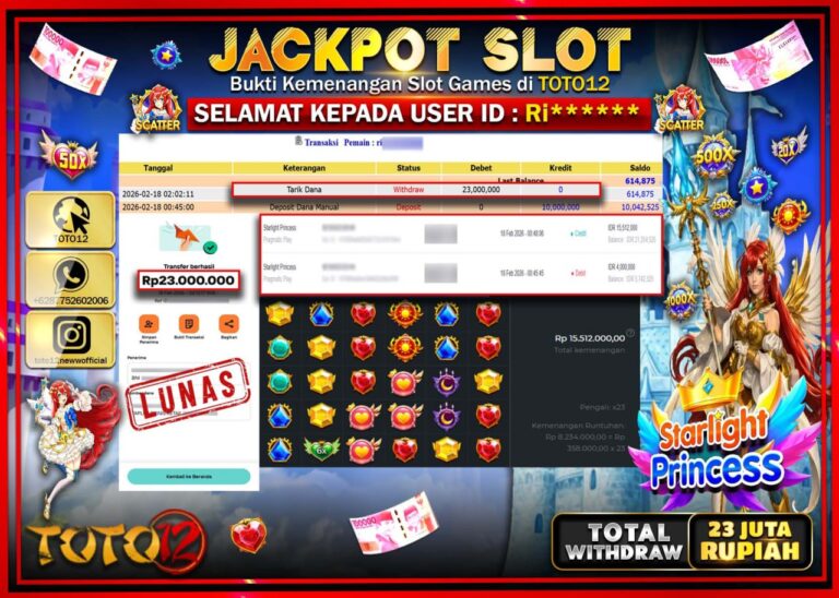 Selamat kepada Member Kami Ri******* Telah Jackpot dan berhasil mendapatkan kemenangan besar pada permainan JACKPOT SLOT GAME (STARLIGHT PRINCESS) Dengan Kemenangan Sebesar Rp.23.000.000–. Setelah mengisi Fomulir Withdraw dengan Kurang waktu 1-2 Menit Dana sudah kami Trasnfer kepada Pemilik Userid dan dana sudah dapat di cairkan oleh pemenang. Bukti Pembayaran yang TOTO12 berikan merupakan Bukti Pembayaran yang SAH…