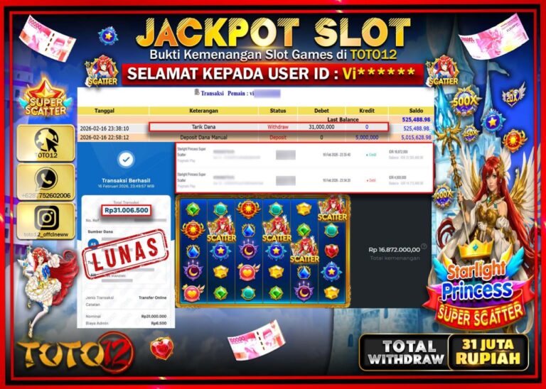 Selamat kepada Member Kami Vi******* Telah Jackpot dan berhasil mendapatkan kemenangan besar pada permainan JACKPOT SLOT GAME (STARLIGHT PRINCESS SUPER SCATTER) Dengan Kemenangan Sebesar Rp.31.000.000–. Setelah mengisi Fomulir Withdraw dengan Kurang waktu 1-2 Menit Dana sudah kami Trasnfer kepada Pemilik Userid dan dana sudah dapat di cairkan oleh pemenang. Bukti Pembayaran yang TOTO12 berikan merupakan Bukti…