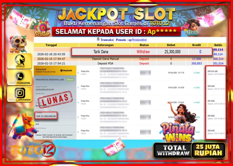 Selamat kepada Member Kami Ap******* Telah Jackpot dan berhasil mendapatkan kemenangan besar pada permainan JACKPOT SLOT GAME (PINATA WINS) Dengan Kemenangan Sebesar Rp.25.000.000–. Setelah mengisi Fomulir Withdraw dengan Kurang waktu 1-2 Menit Dana sudah kami Trasnfer kepada Pemilik Userid dan dana sudah dapat di cairkan oleh pemenang. Bukti Pembayaran yang TOTO12 berikan merupakan Bukti Pembayaran yang SAH…