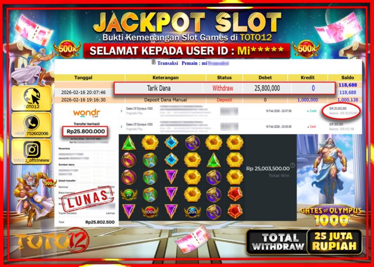 Selamat kepada Member Kami Mi******* Telah Jackpot dan berhasil mendapatkan kemenangan besar pada permainan JACKPOT SLOT GAME (GATES OF OLYMPUS 1000) Dengan Kemenangan Sebesar Rp.25.800.000–. Setelah mengisi Fomulir Withdraw dengan Kurang waktu 1-2 Menit Dana sudah kami Trasnfer kepada Pemilik Userid dan dana sudah dapat di cairkan oleh pemenang. Bukti Pembayaran yang TOTO12 berikan merupakan Bukti…