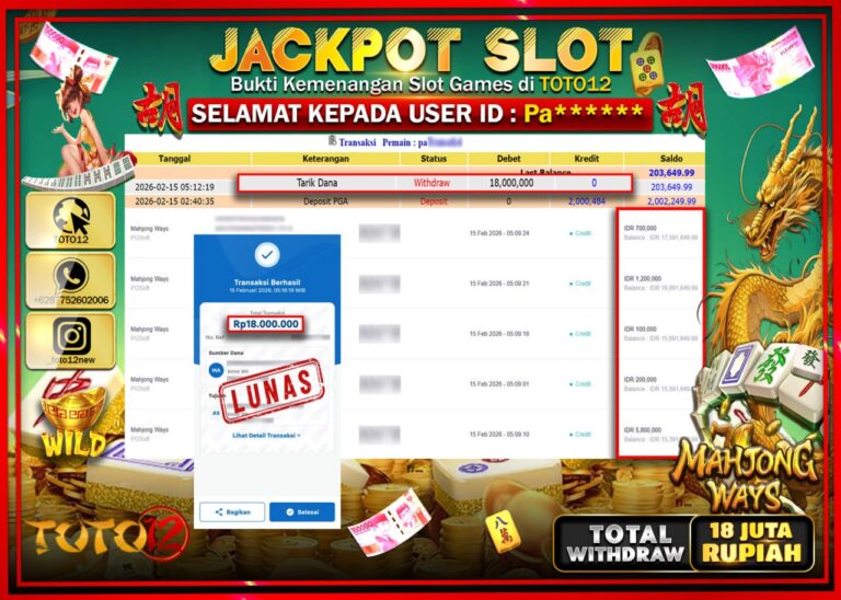 Selamat kepada Member Kami Pa****** Telah Jackpot dan berhasil mendapatkan kemenangan besar pada permainan JACKPOT SLOT GAME (MAHJONG WAYS) Dengan Kemenangan Sebesar Rp.18.000.000–. Setelah mengisi Fomulir Withdraw dengan Kurang waktu 1-2 Menit Dana sudah kami Trasnfer kepada Pemilik Userid dan dana sudah dapat di cairkan oleh pemenang. Bukti Pembayaran yang TOTO12 berikan merupakan Bukti Pembayaran yang SAH…