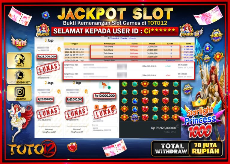 Selamat kepada Member Kami Ci***** Telah Jackpot dan berhasil mendapatkan kemenangan besar pada permainan JACKPOT SLOT GAME (STARLIGHT PRINCESS 1000) Dengan Kemenangan Sebesar Rp.78.000.000–. Setelah mengisi Fomulir Withdraw dengan Kurang waktu 1-2 Menit Dana sudah kami Trasnfer kepada Pemilik Userid dan dana sudah dapat di cairkan oleh pemenang. Bukti Pembayaran yang TOTO12 berikan merupakan Bukti Pembayaran…