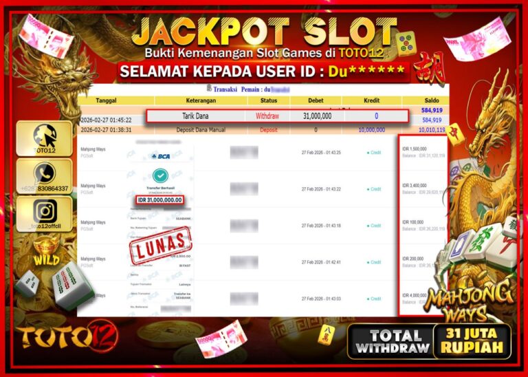 Selamat kepada Member Kami Du***** Telah Jackpot dan berhasil mendapatkan kemenangan besar pada permainan JACKPOT SLOT GAME (MAHJONG WAYS) Dengan Kemenangan Sebesar Rp.31.000.000–. Setelah mengisi Fomulir Withdraw dengan Kurang waktu 1-2 Menit Dana sudah kami Trasnfer kepada Pemilik Userid dan dana sudah dapat di cairkan oleh pemenang. Bukti Pembayaran yang TOTO12 berikan merupakan Bukti Pembayaran yang SAH…